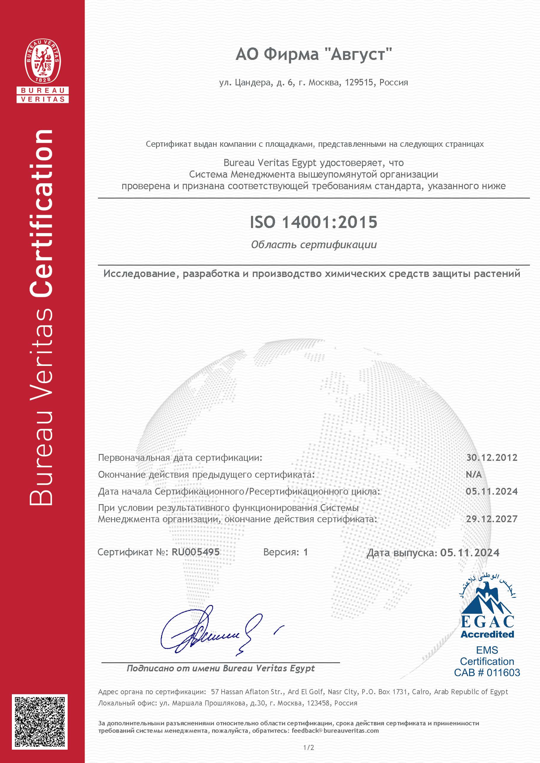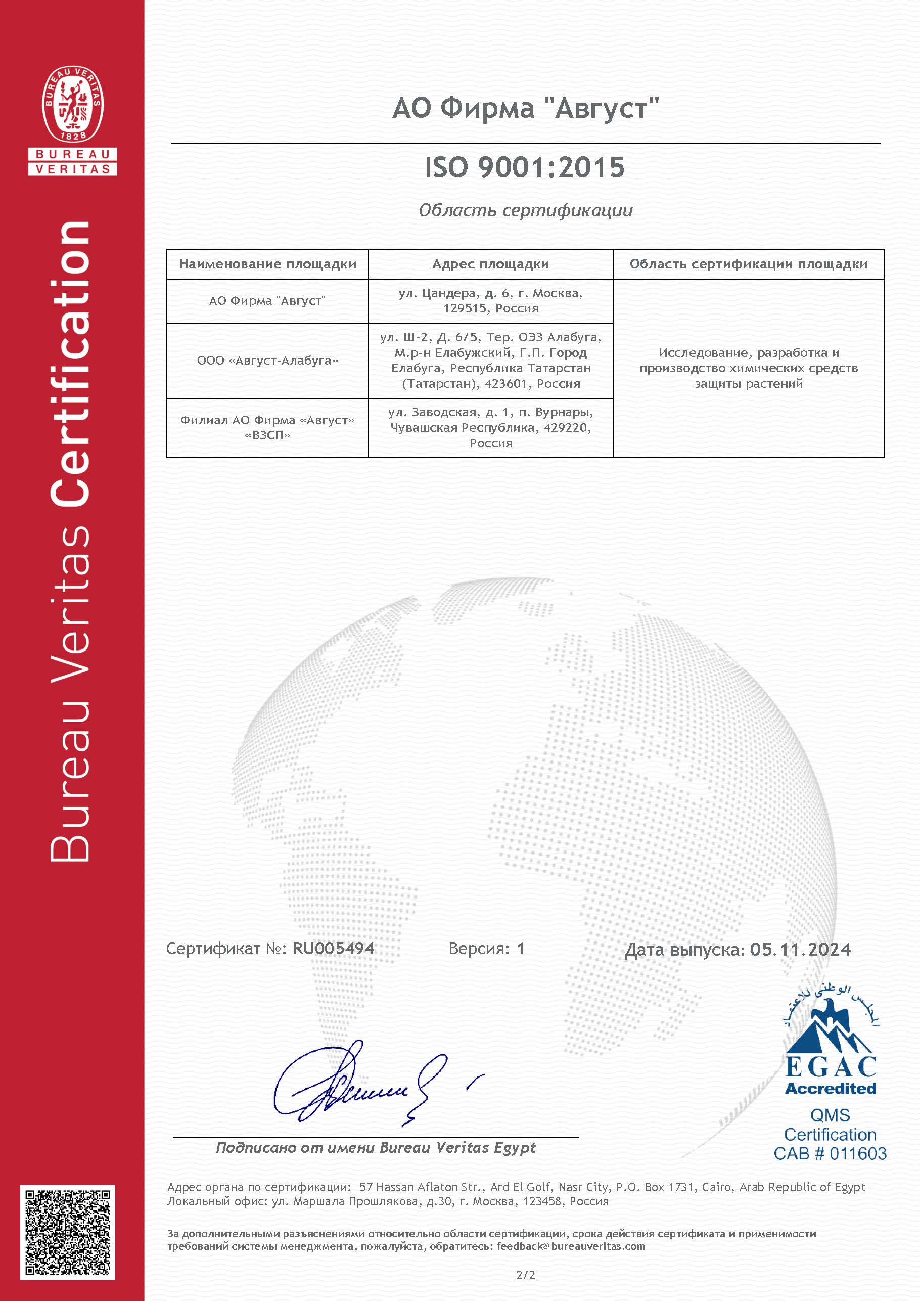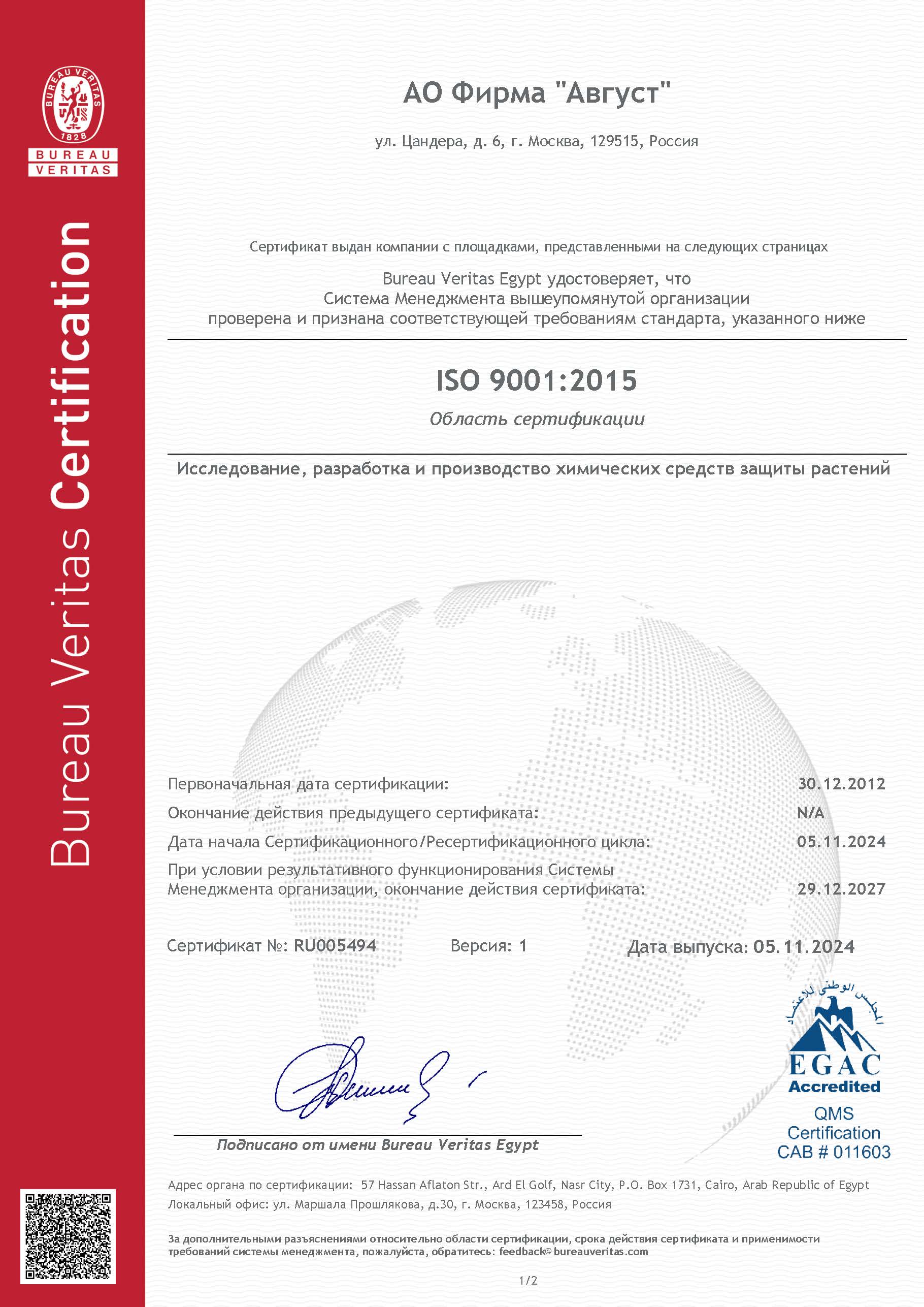 სს ფირმა August-ის მიერ შემუშავებული QMS-ის შესაბამისობა სტანდარტის მოთხოვნებთან დადასტურდა 2007 წლის აპრილში რეპუტაციის მქონე საერთაშორისო სასერთიფიკატო ორგანოს Bureau Veritas სერტიფიკაციის მიერ.